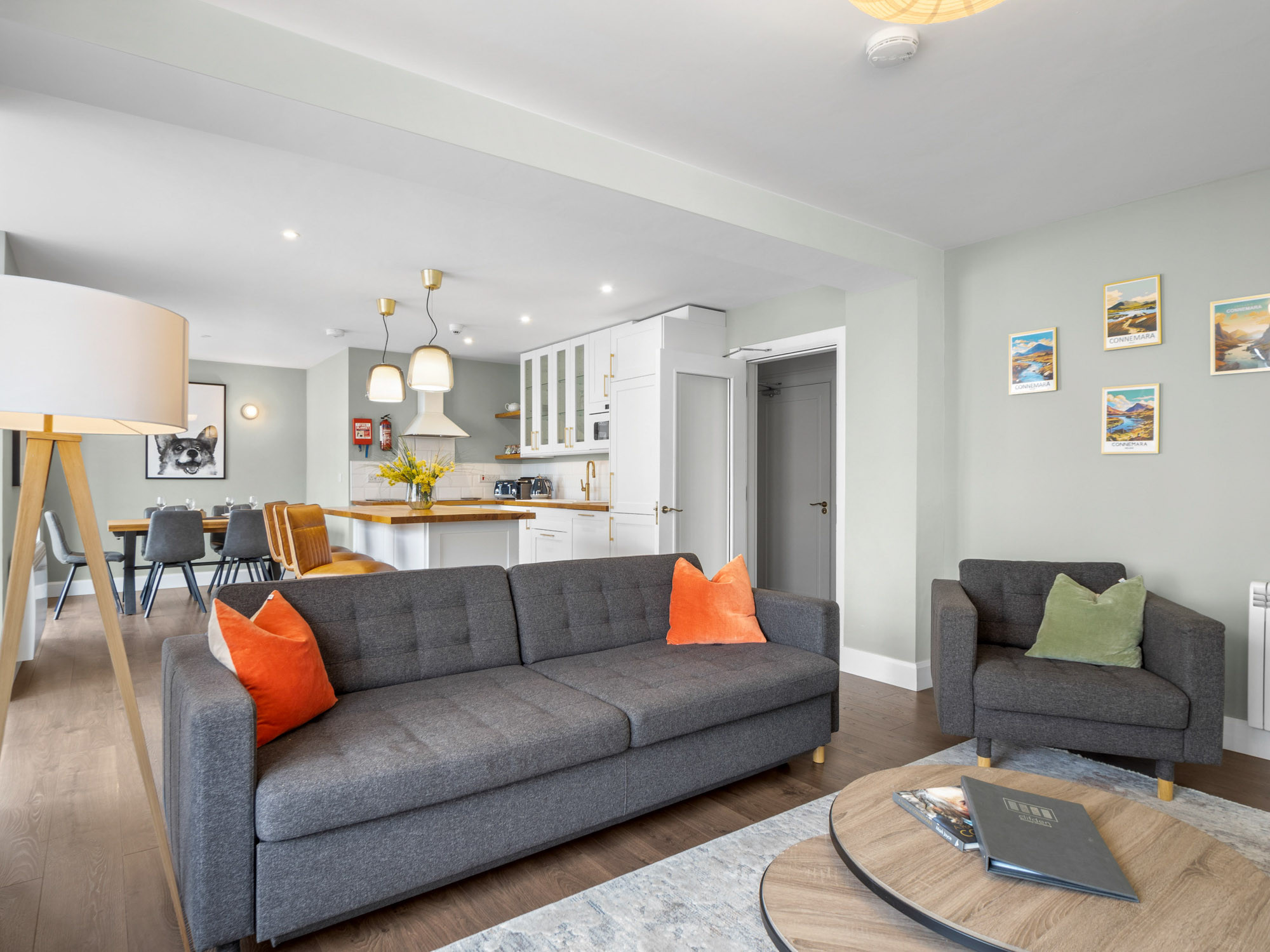 Clifden Main Street Holiday Apartment – Sleeps 8This 4 bed sleeps 8 holiday apartment comprises of a beautifully furnished lounge, well equipped kitchen and dining area, with access to the lower terrace with outdoor furniture.