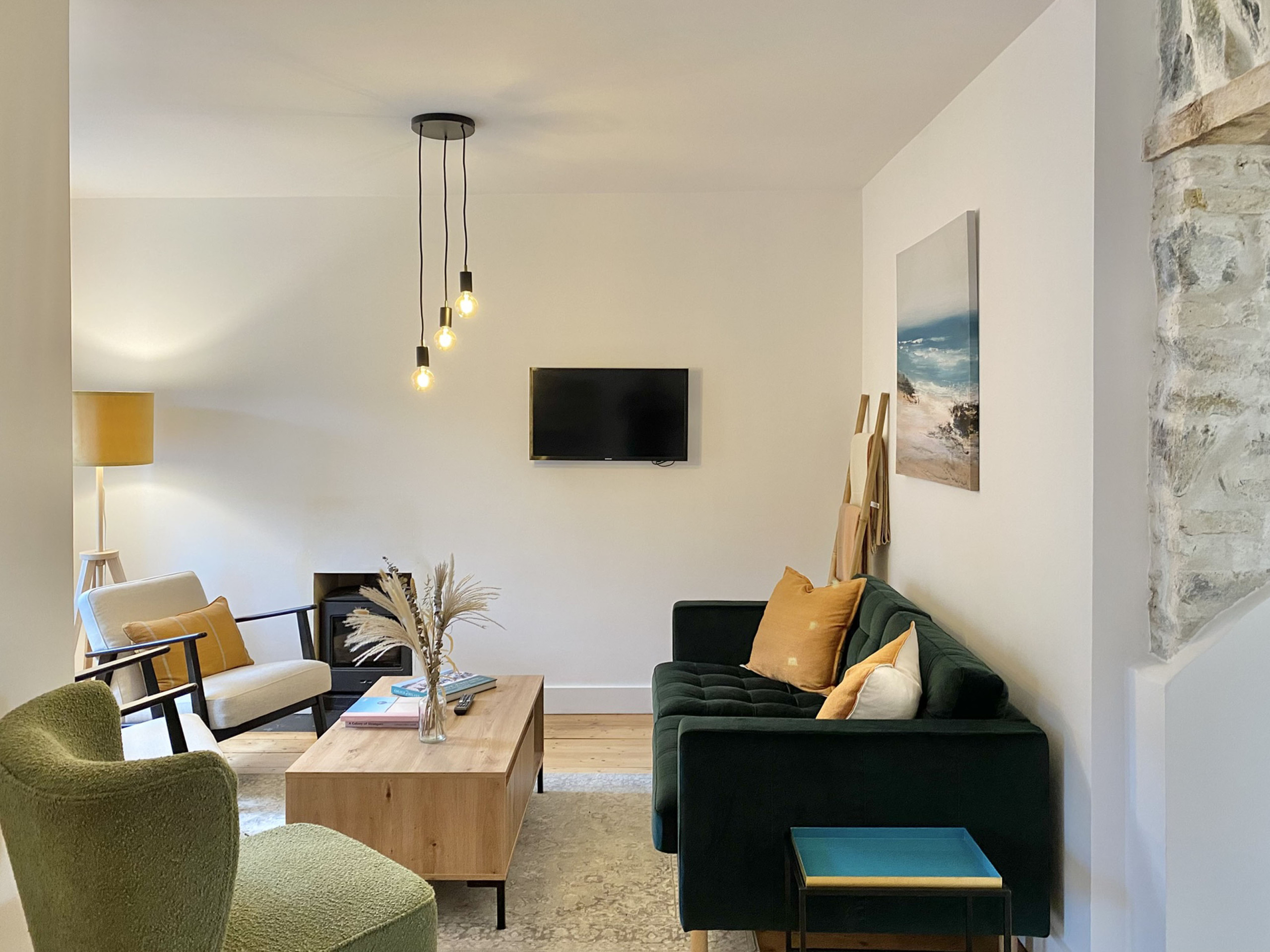 - Lounge area with comfortable sofa, coffee table, and wall-mounted smart TV with multi-channel services