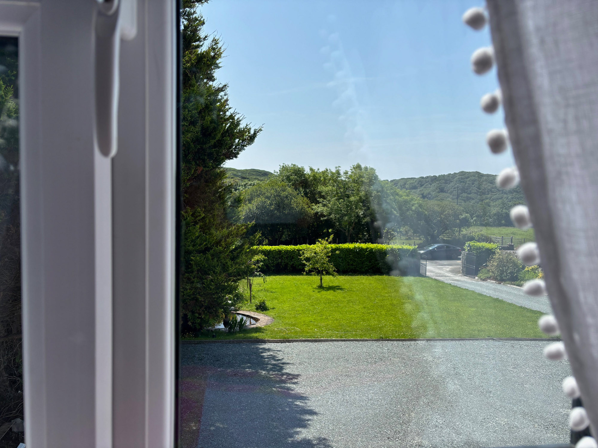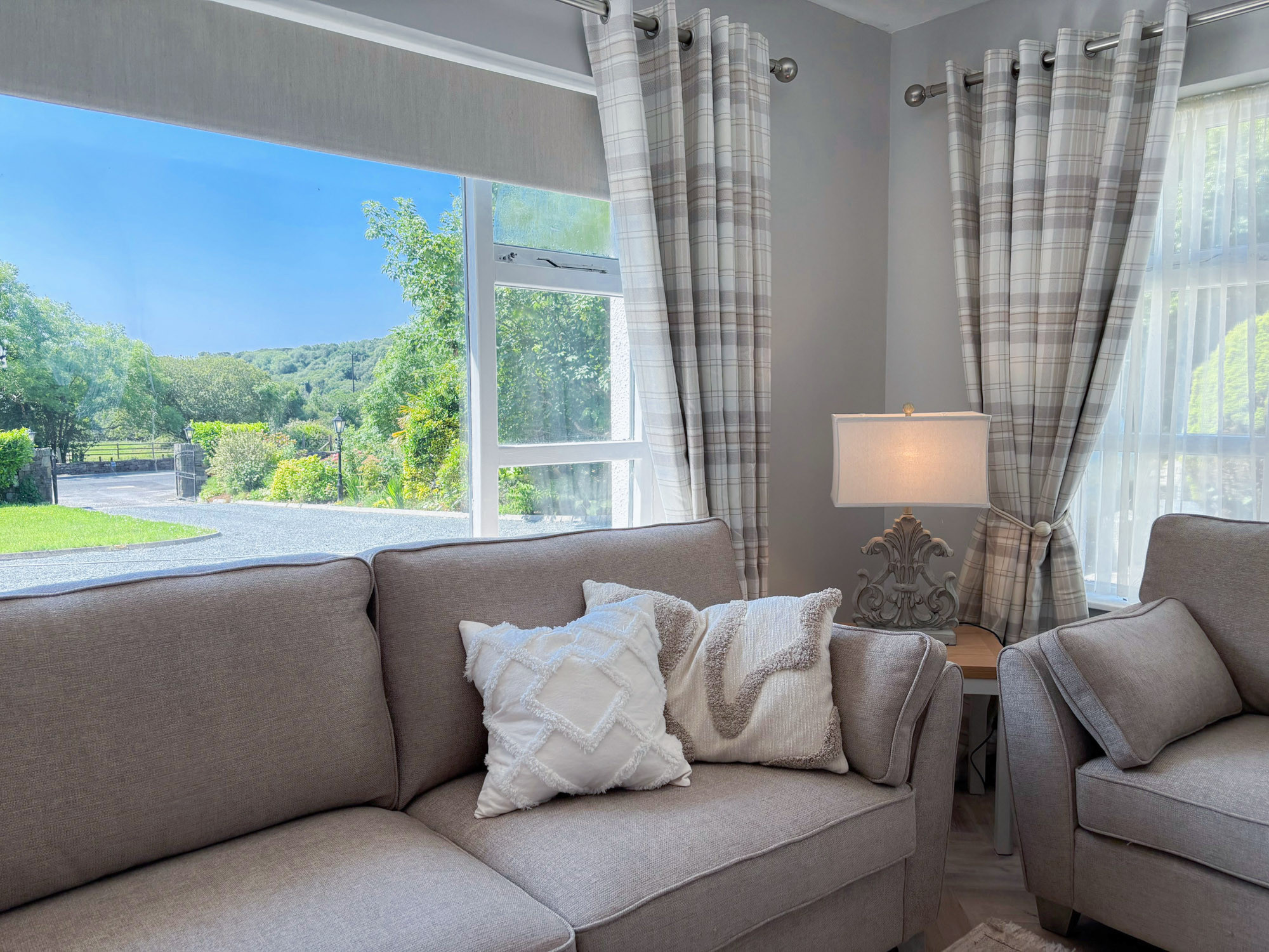 - Modern living room with open fire, multi-channel smart TV, with views of the surrounding countryside, boglands and Errisbeg hill in the distance