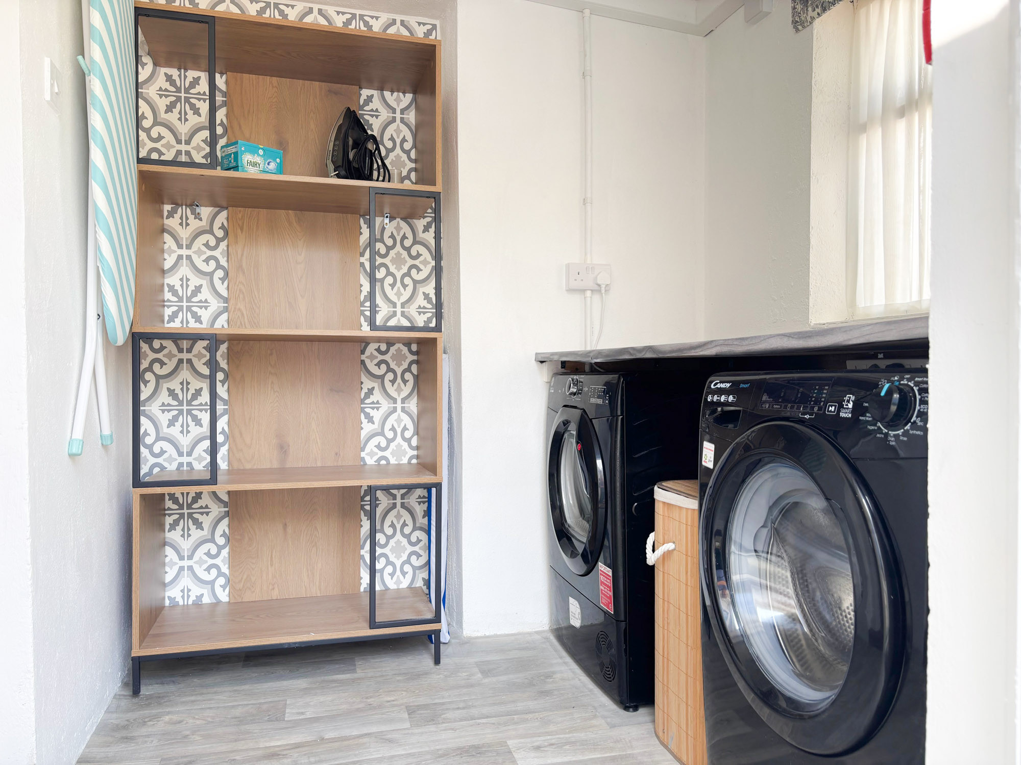 - Utility room with a microwave, fridge freezer and a washing machine and tumble dryer