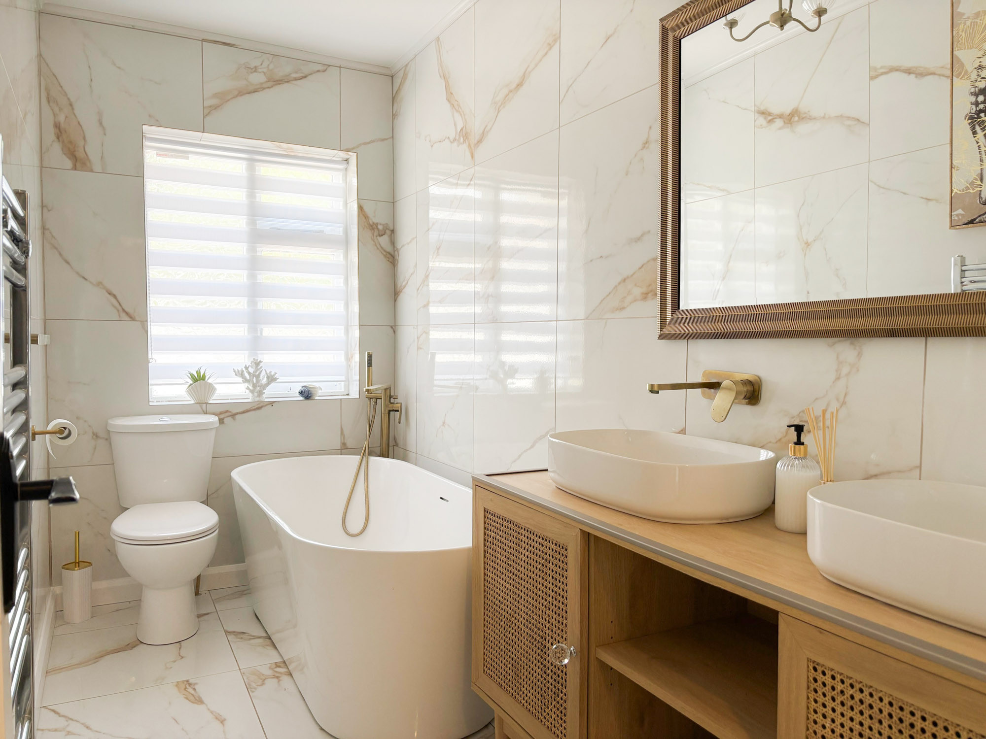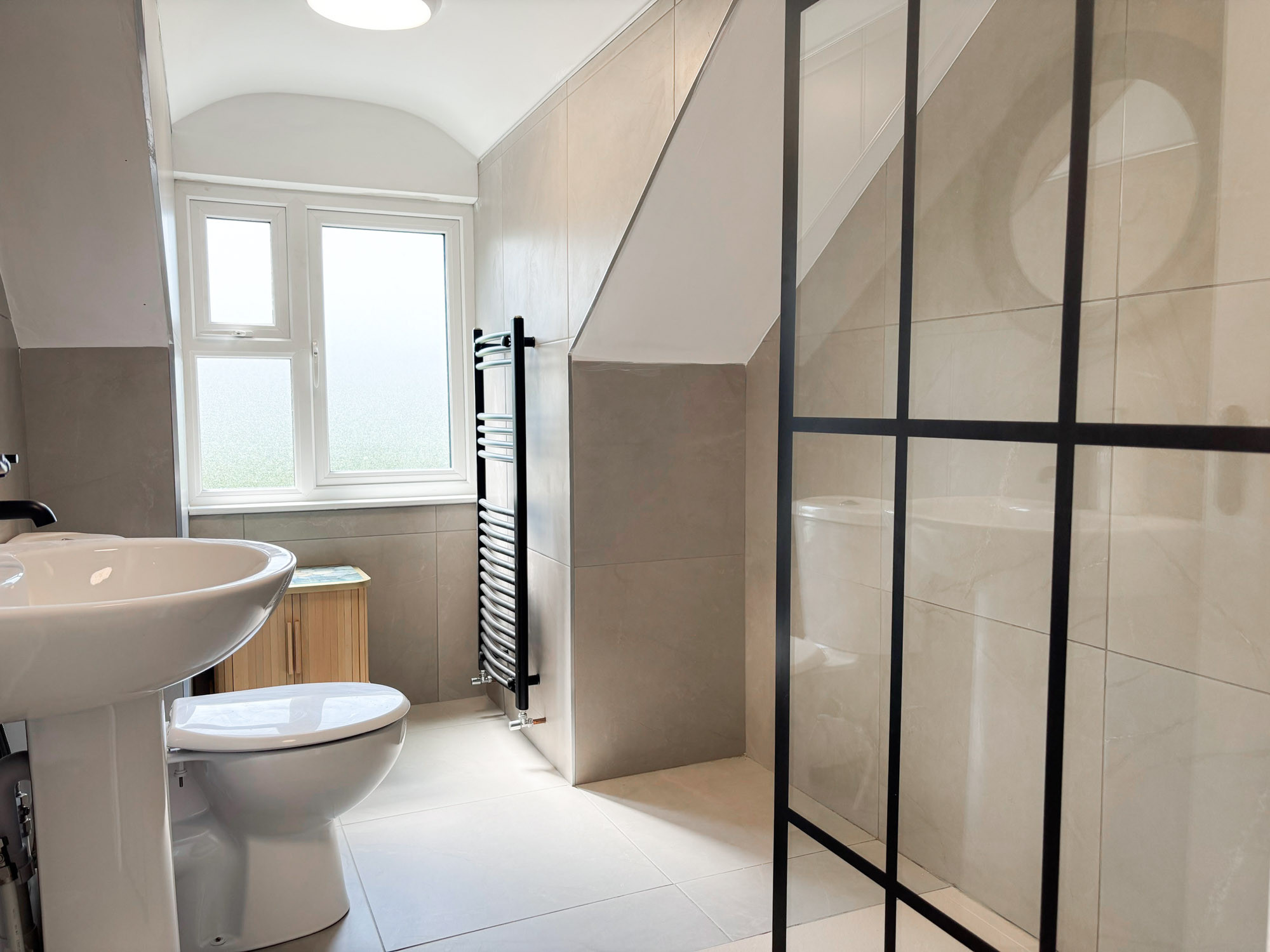- Main bathroom with bath, electric shower over bath, WC and hand basin