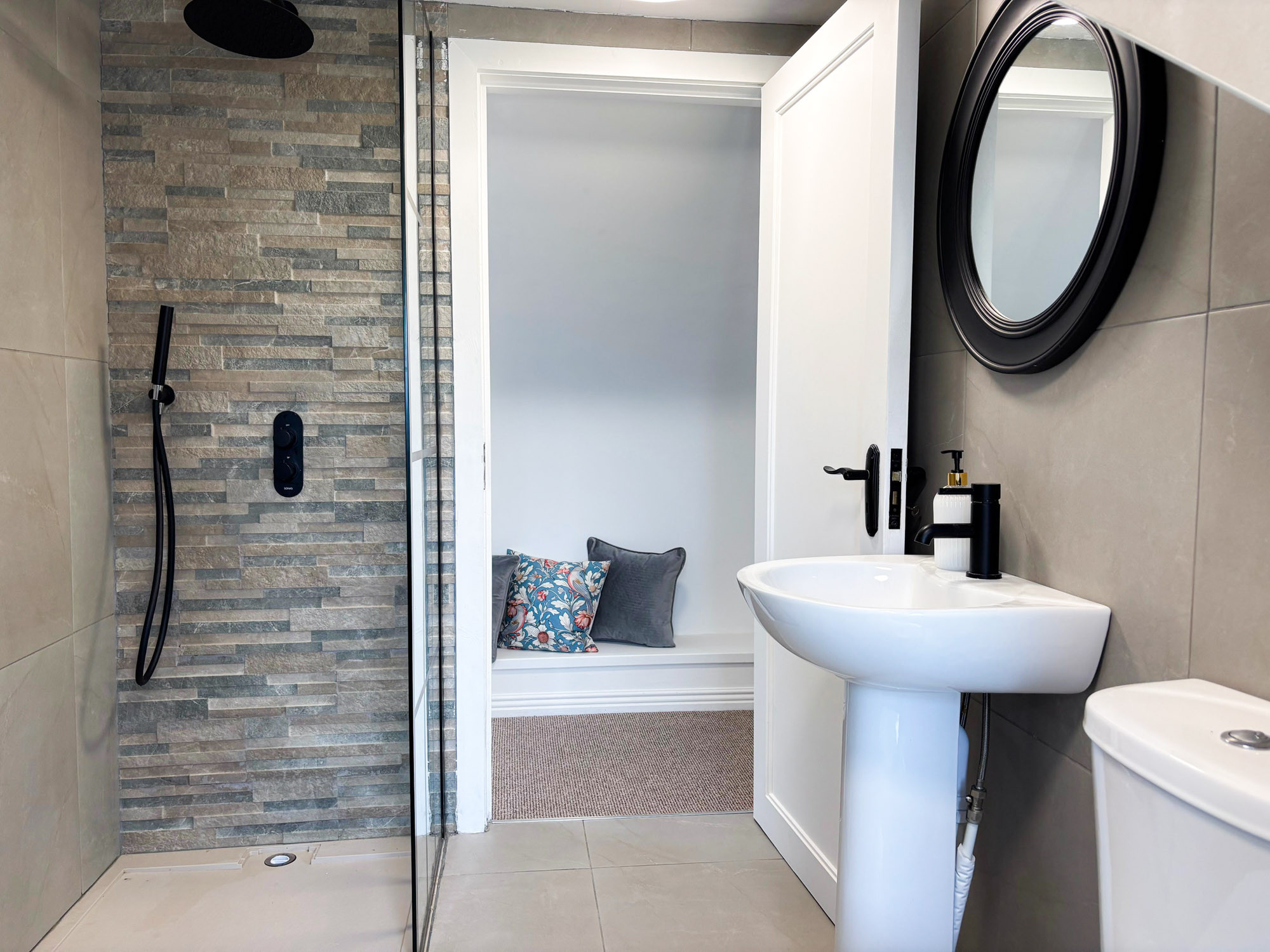 - Family bathroom with WC, hand basin and bath with overhead shower