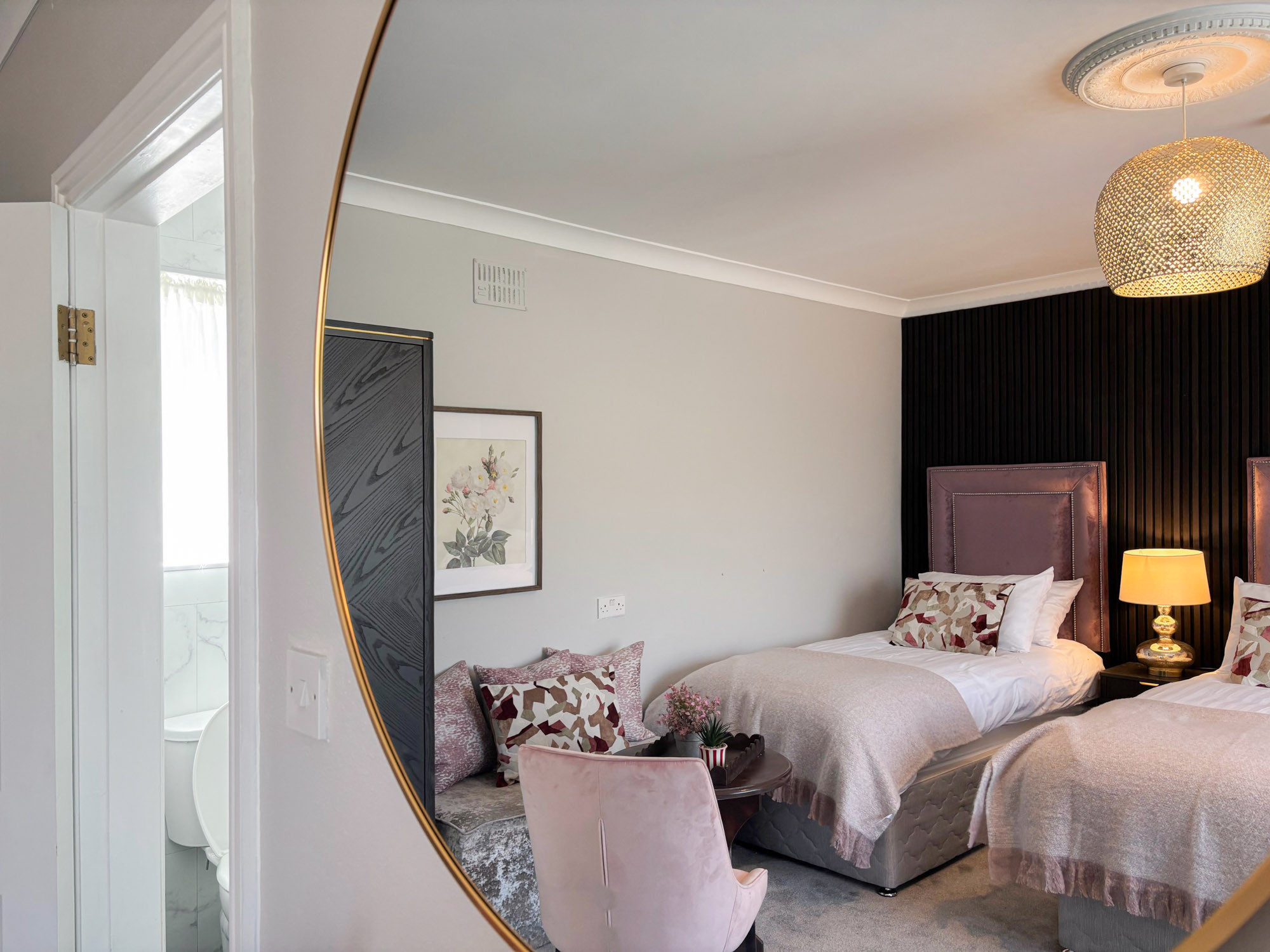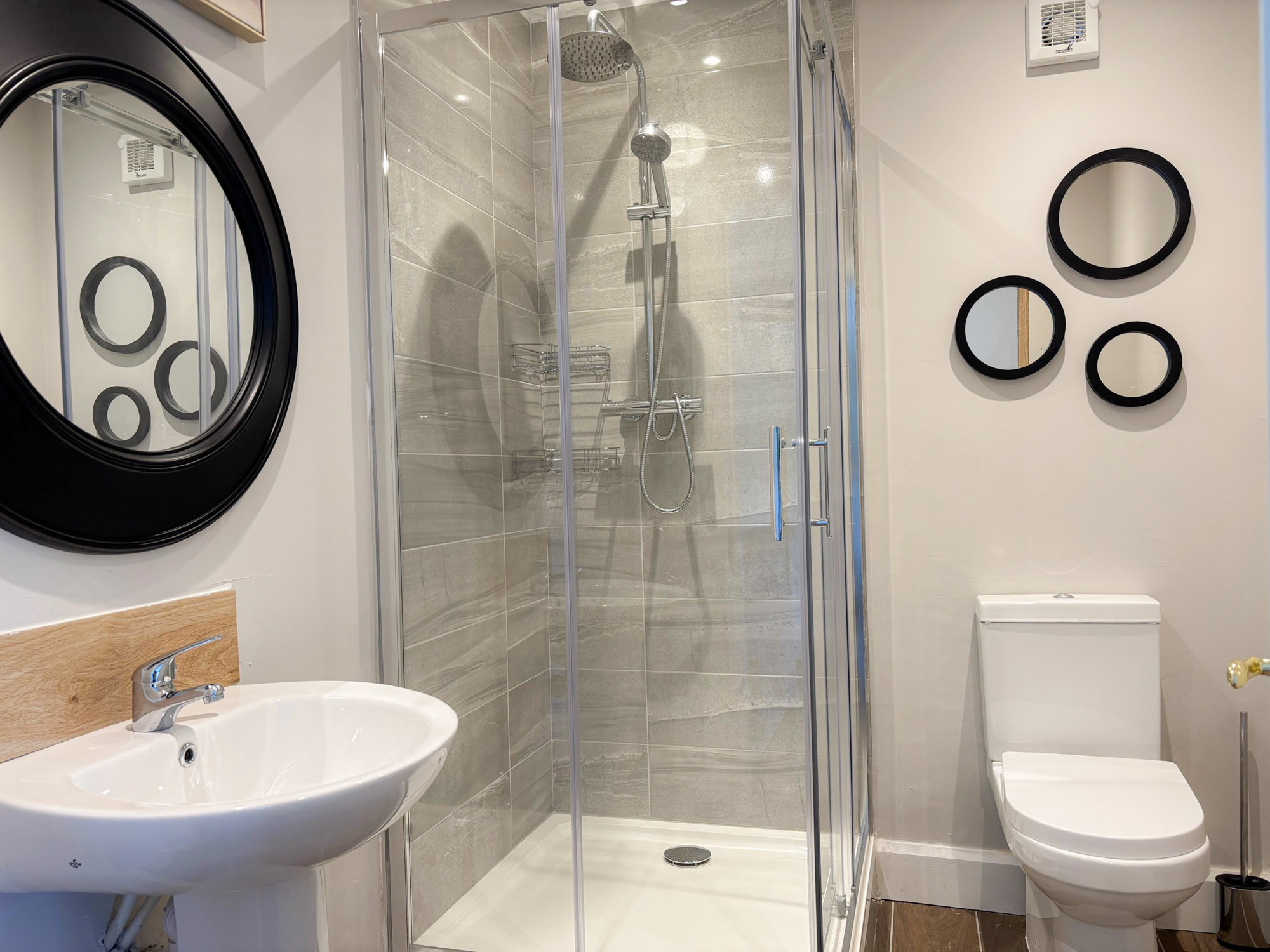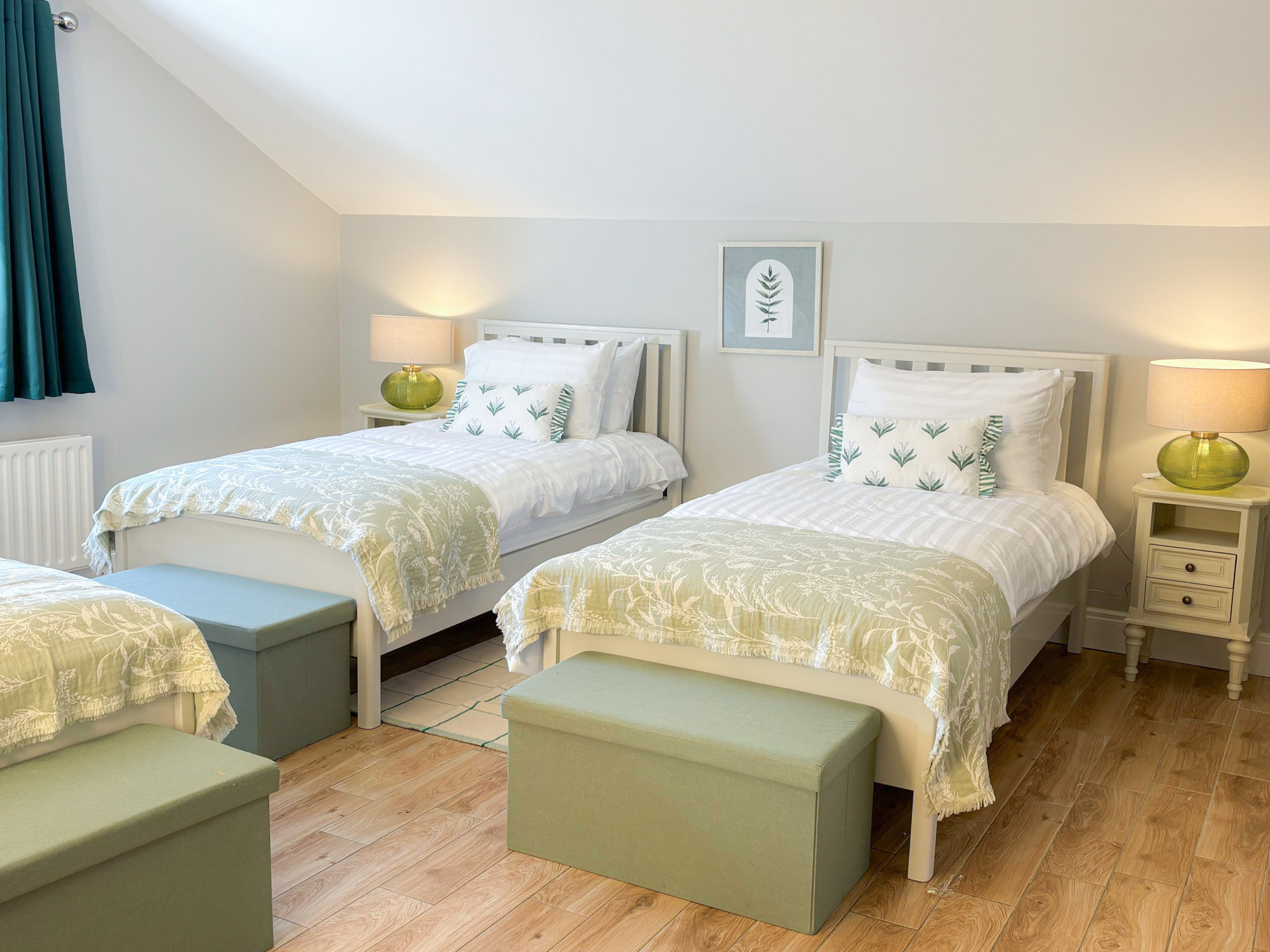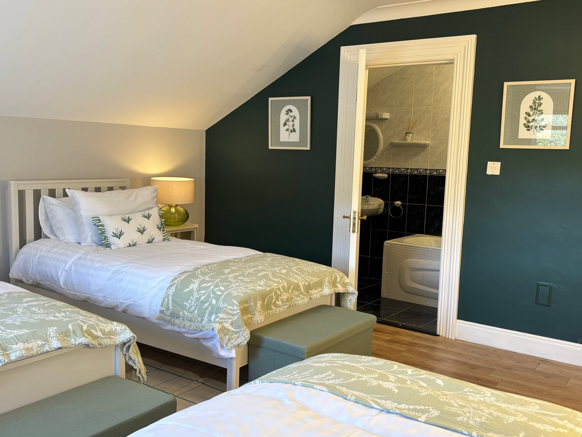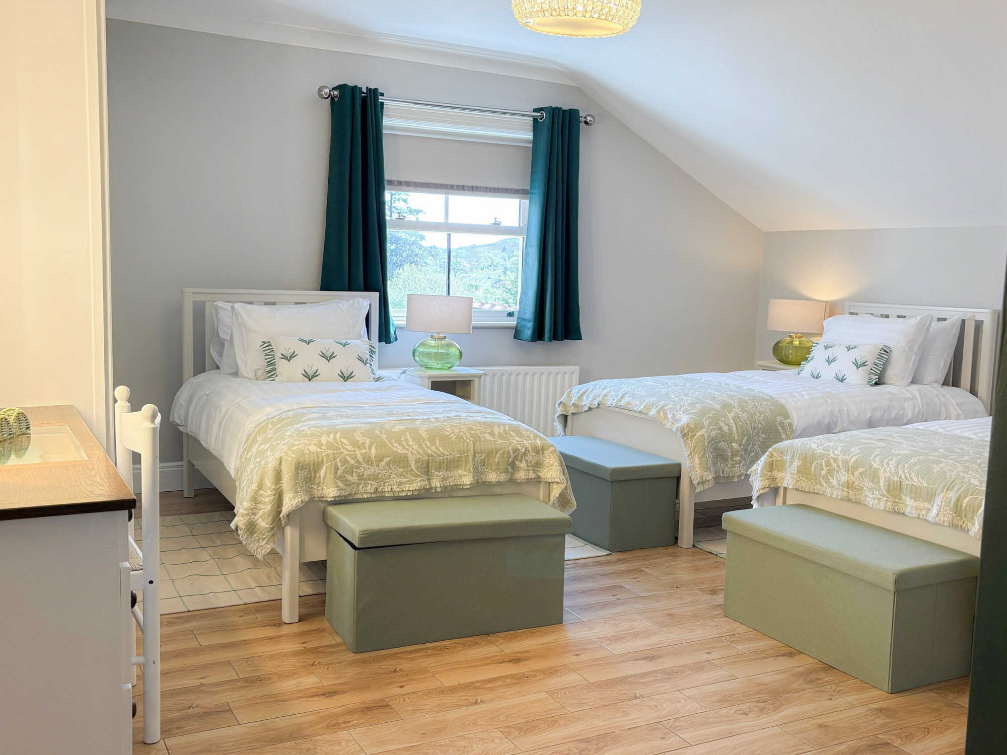 - Bedroom 2: Triple room with three single beds and en-suite (shower, WC and hand basin), sleeping 3