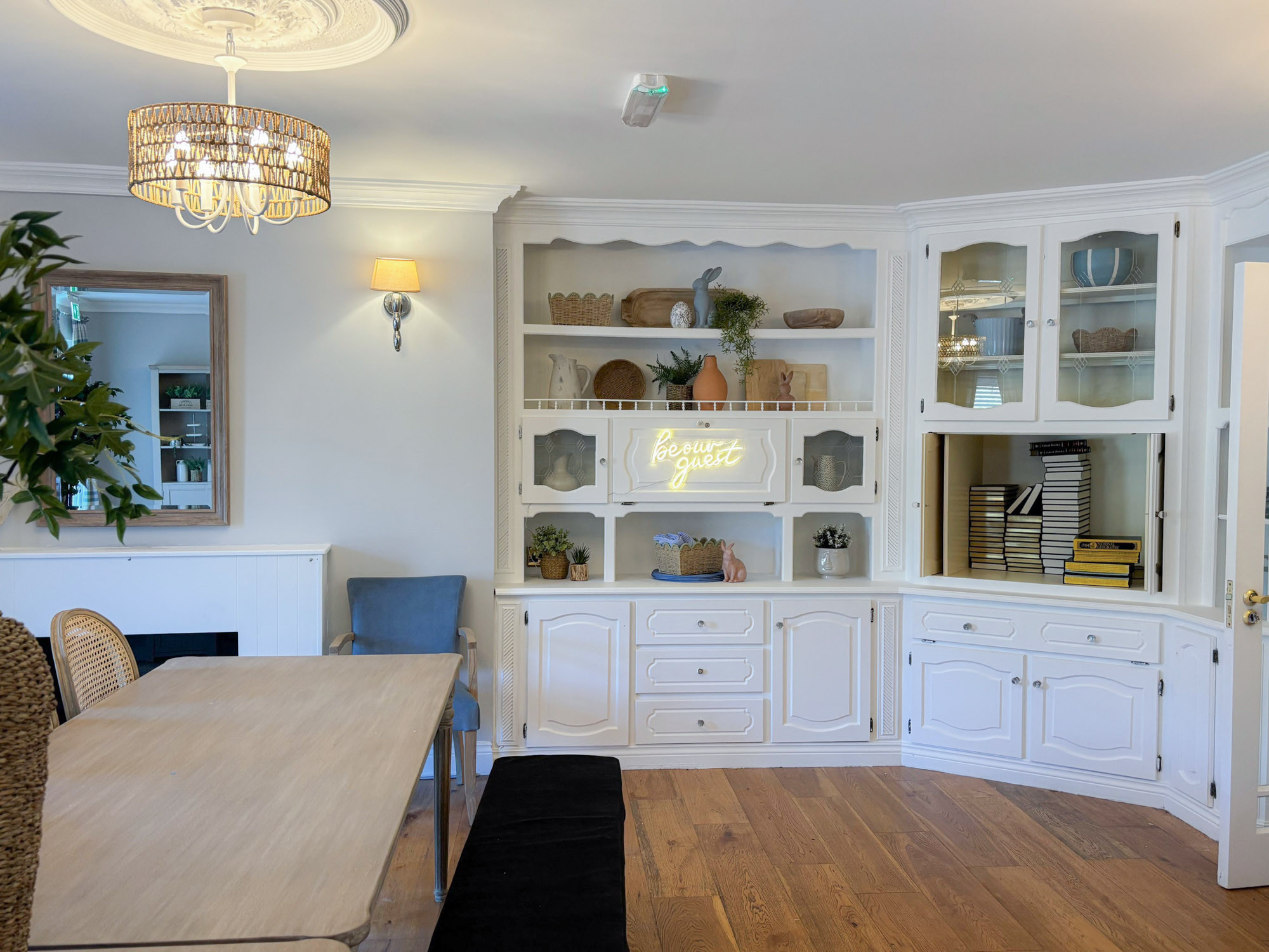 - Dining area with large table and seating for group meals