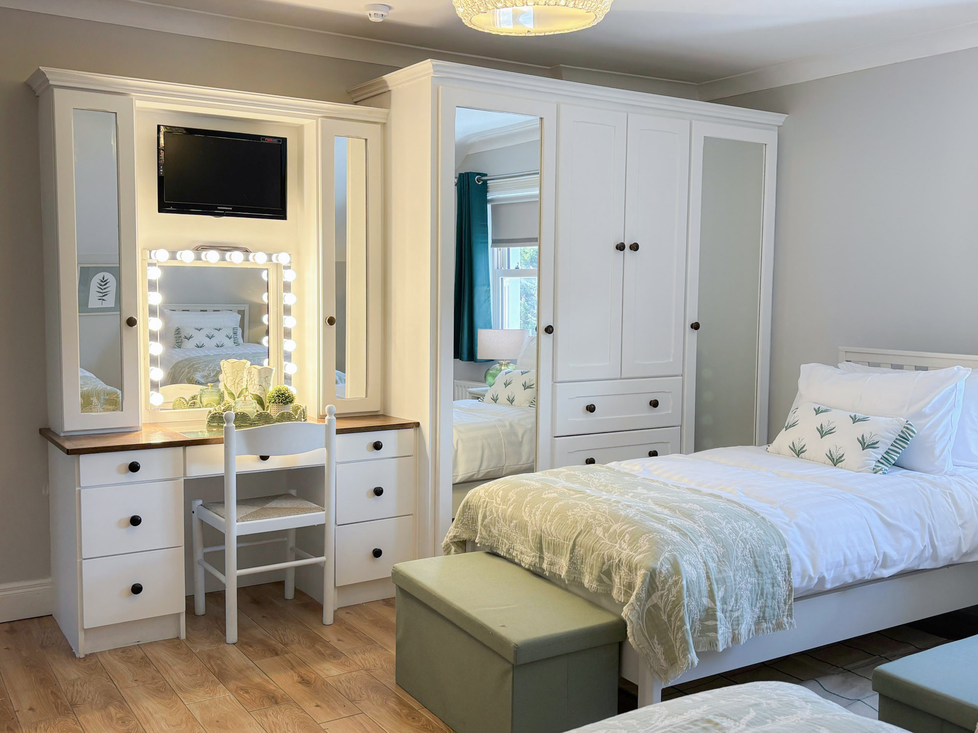 - Bedroom 8: Triple room with three single beds and en-suite (bath with overhead shower, WC and hand basin), sleeping 3