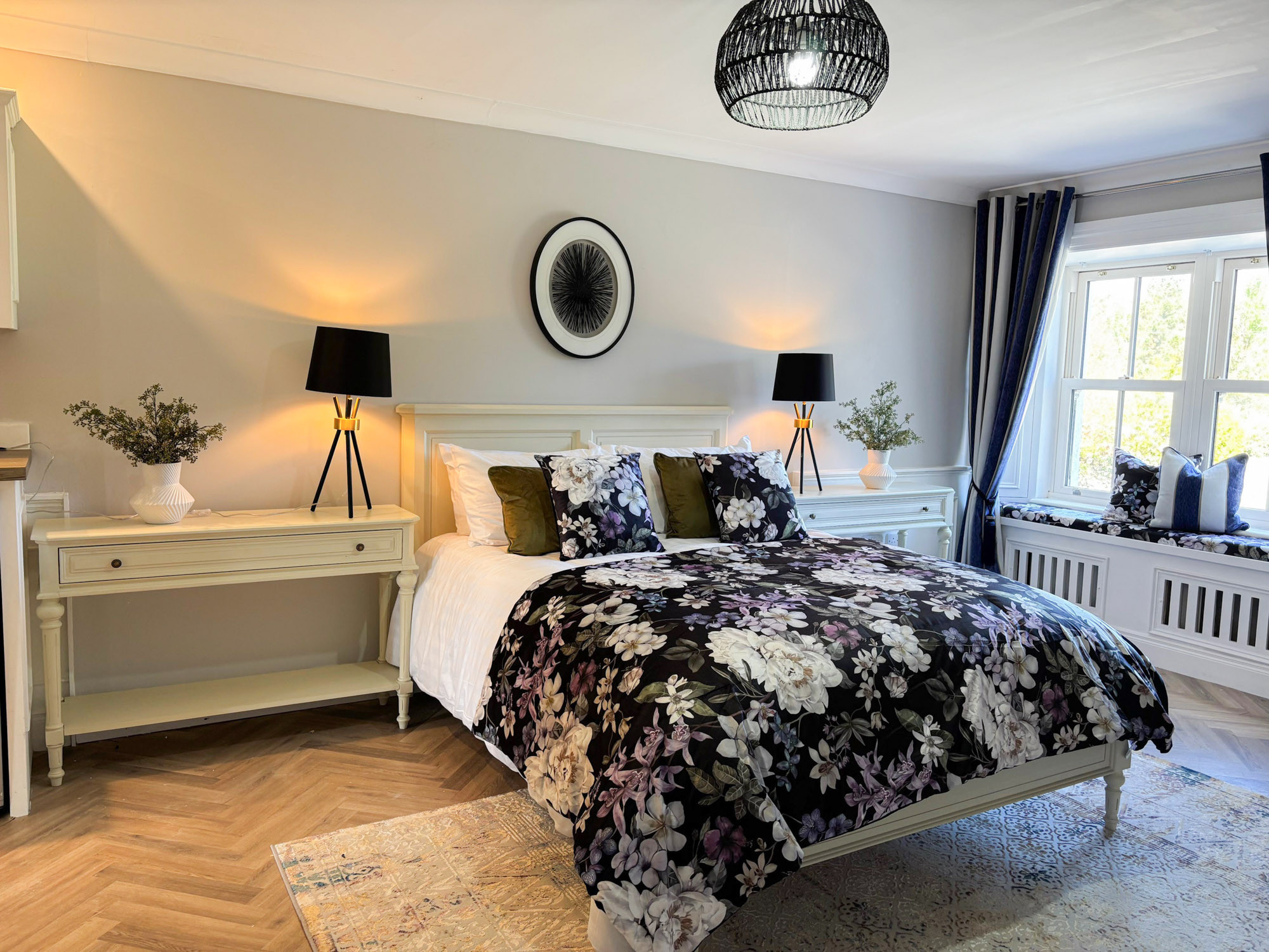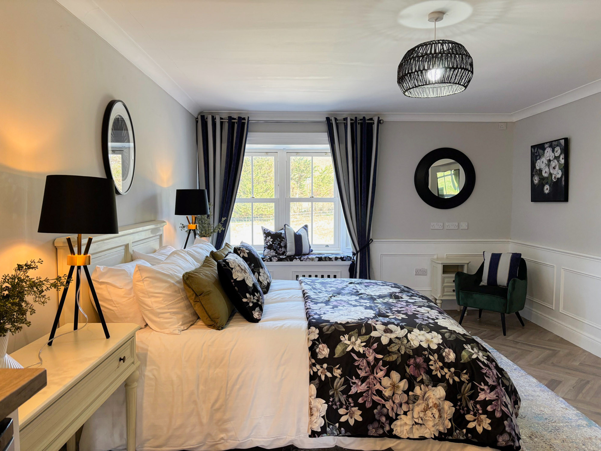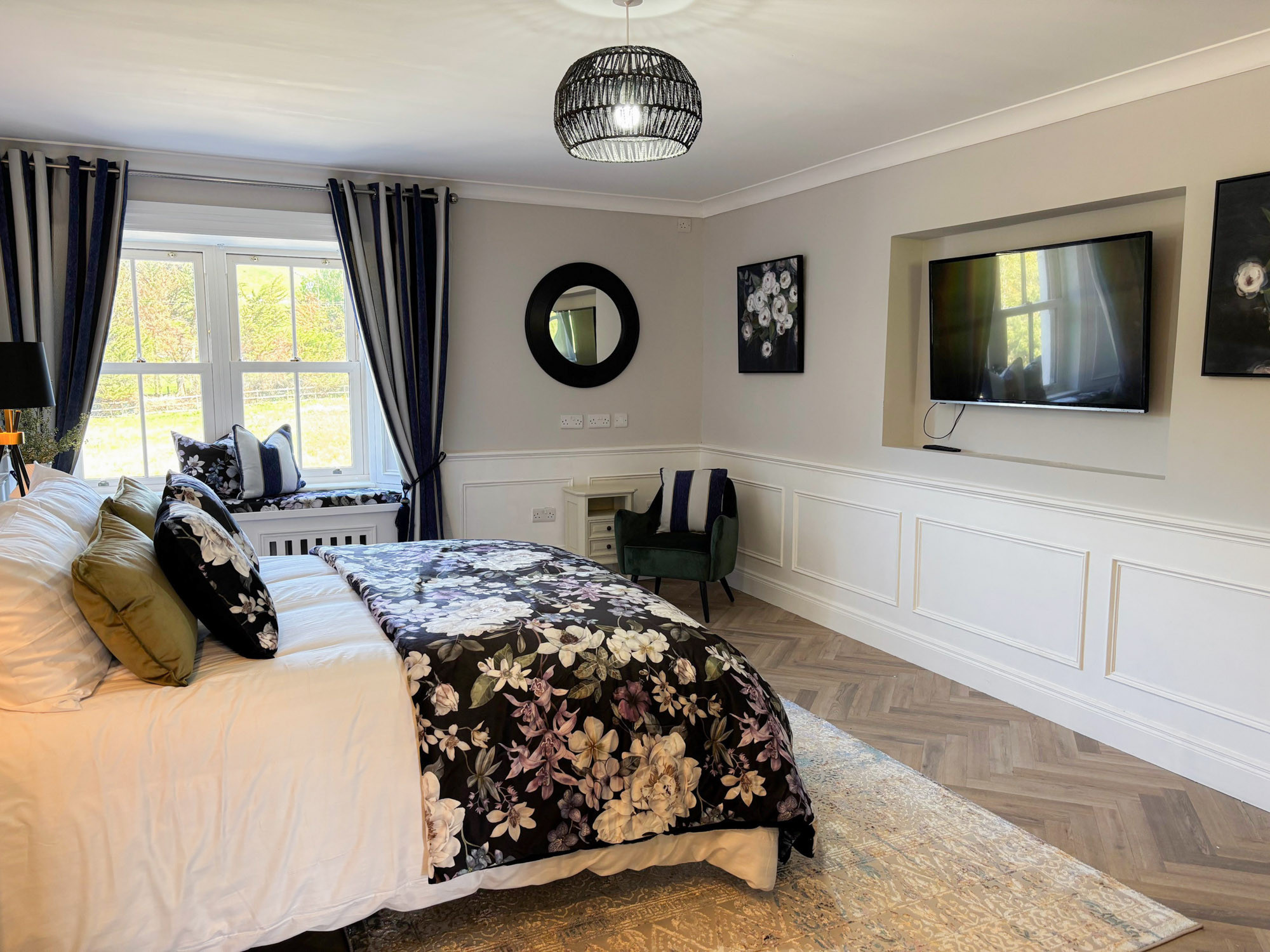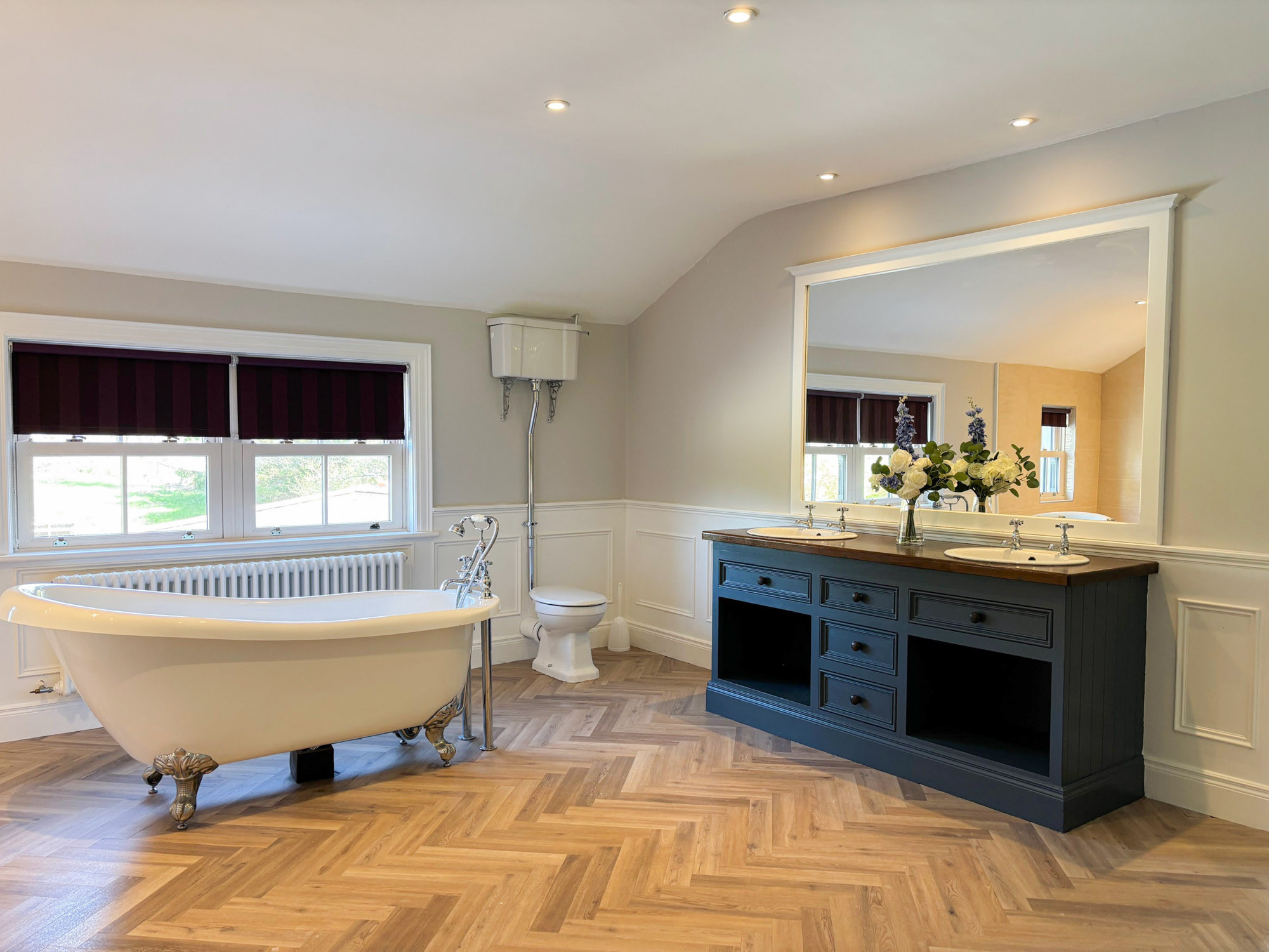 - Bedroom 3: Master king-size bedroom with en-suite (wet room shower, roll-top bath, double basin and WC), sleeping 2