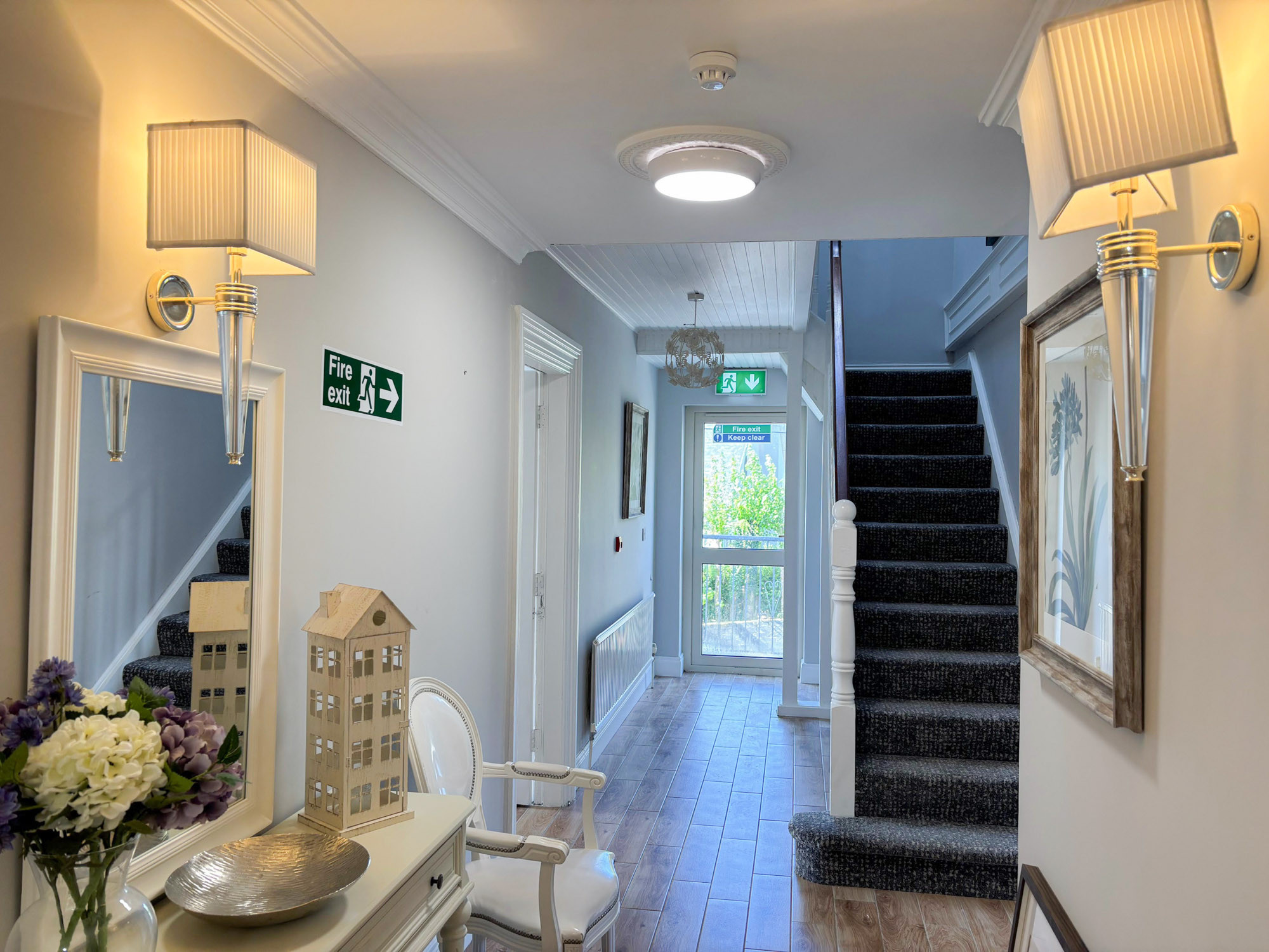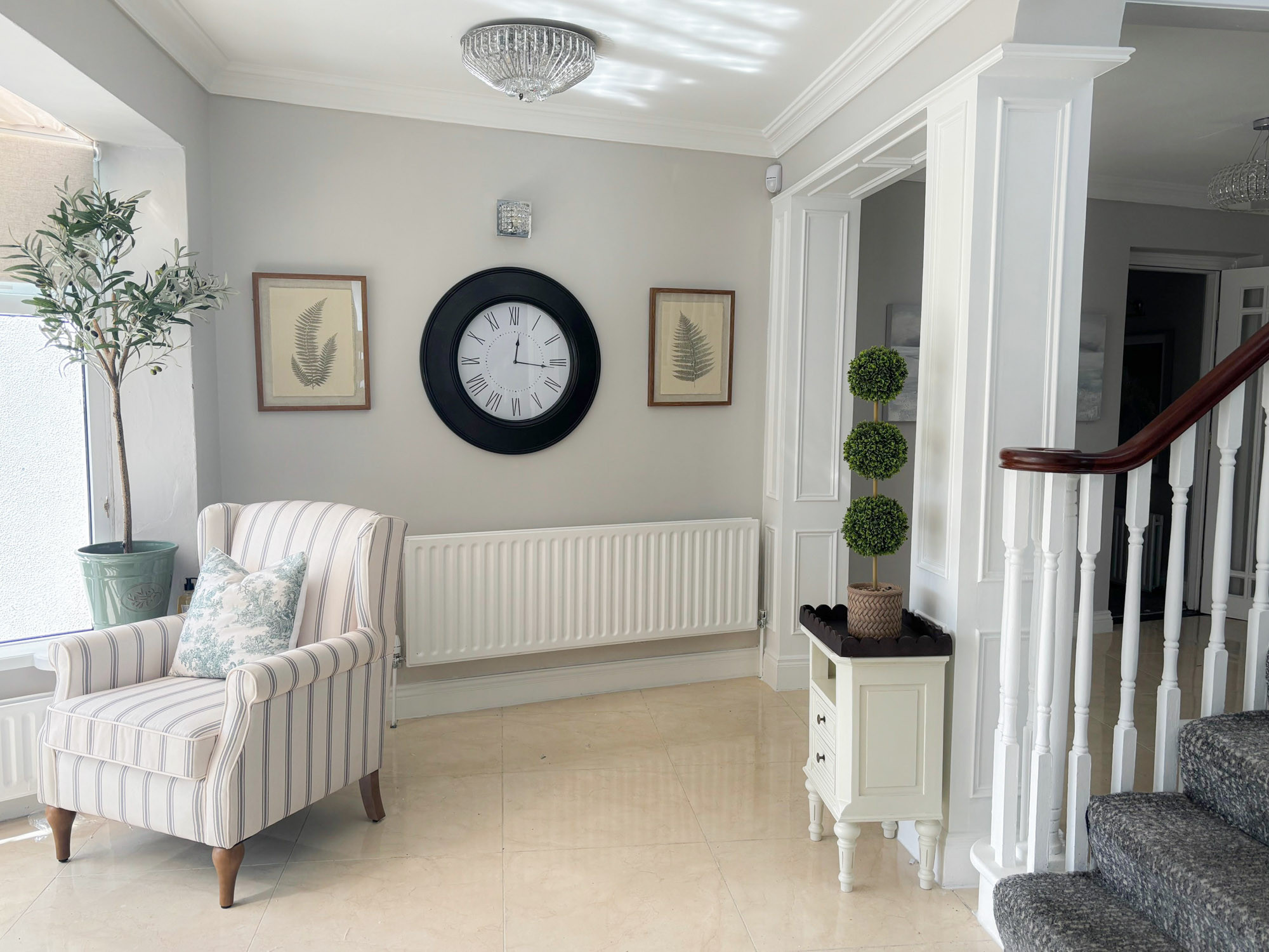 - Entrance reception area with seating and staircase to upper floors