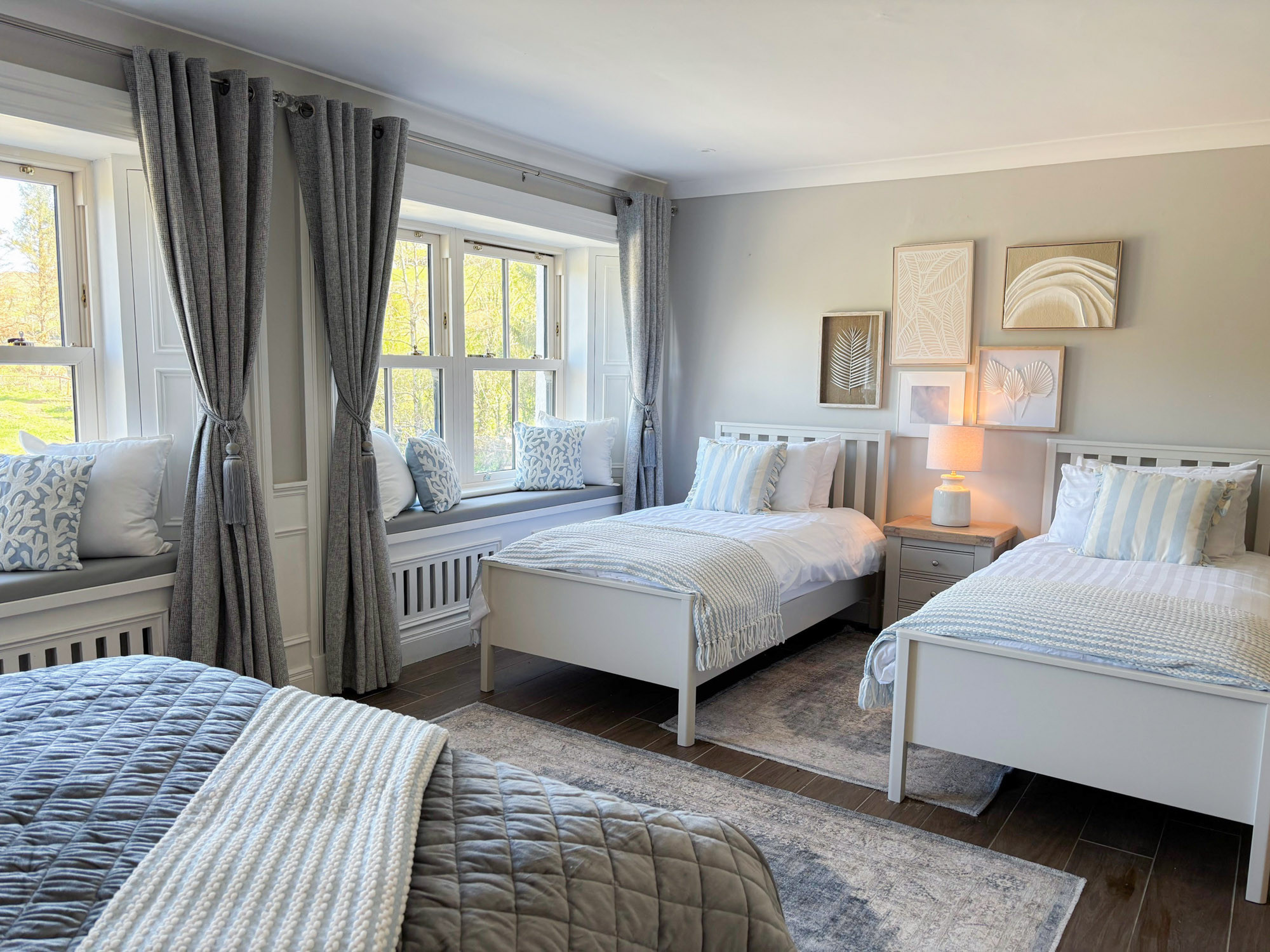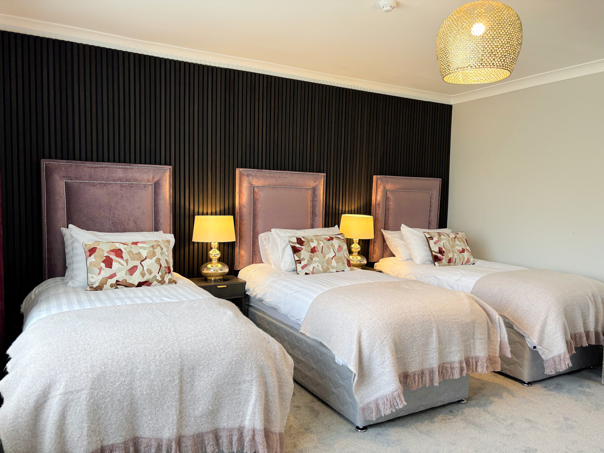 - Bedroom 5: Family room with king-size bed and two single beds, en-suite (shower, WC and hand basin), sleeping 4