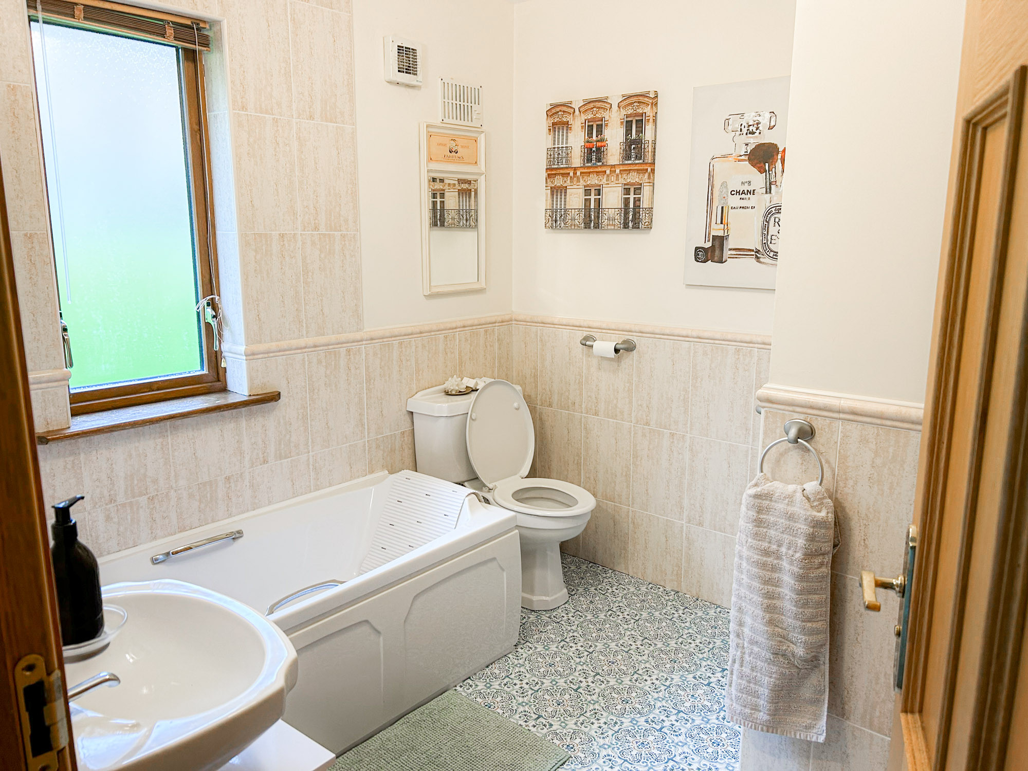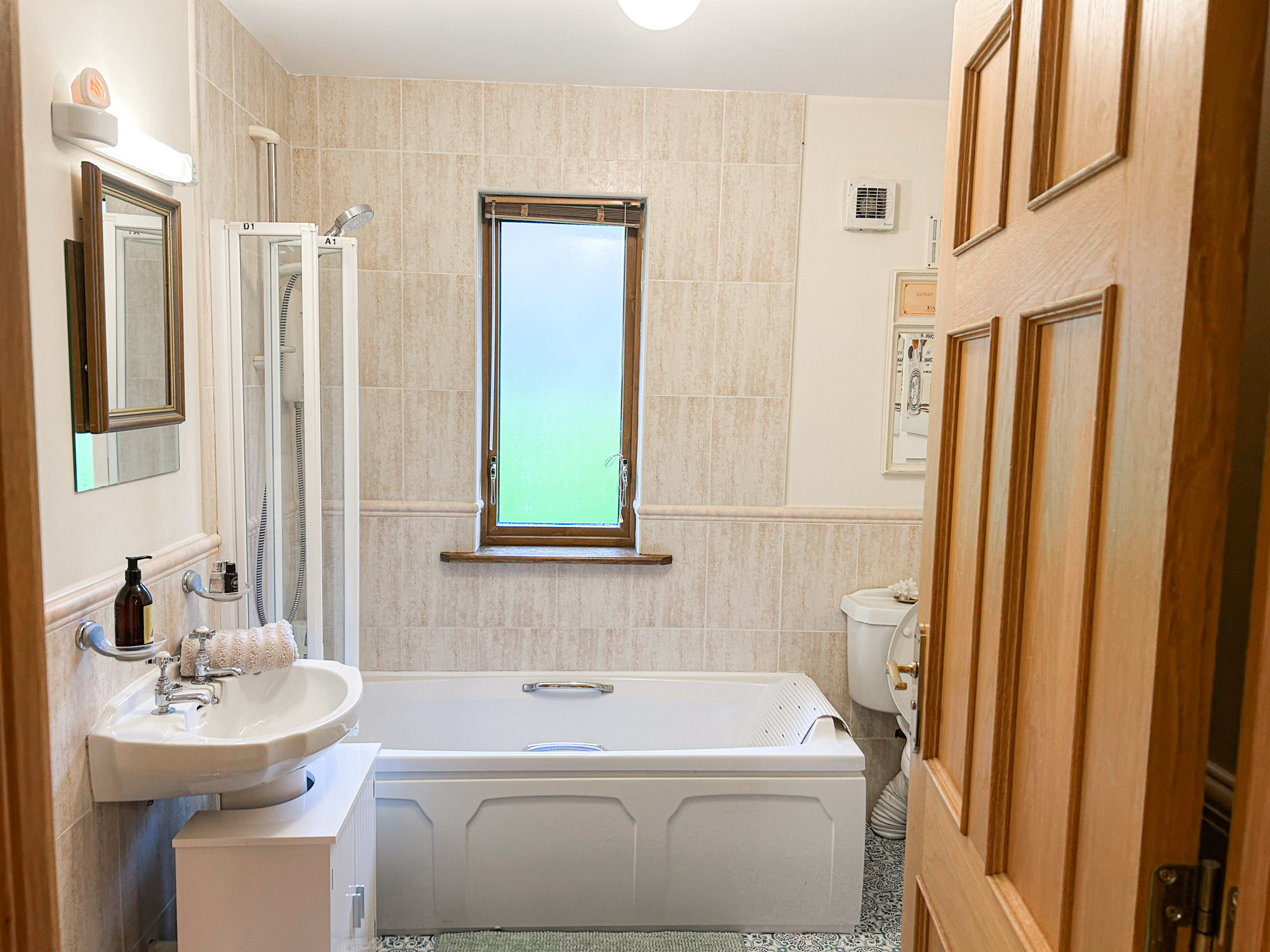 - Main bathroom with WC, hand basin, bath and shower over bath