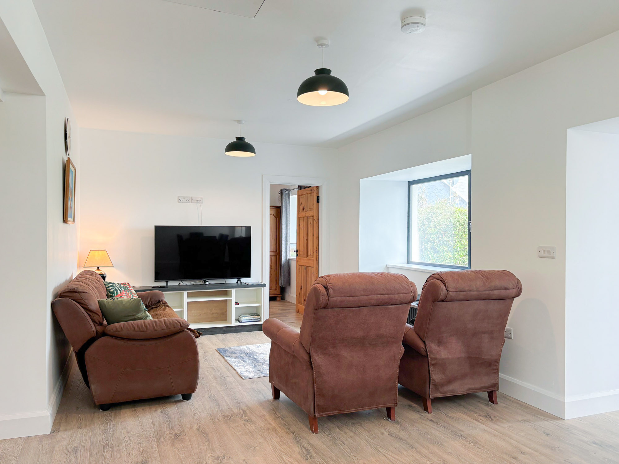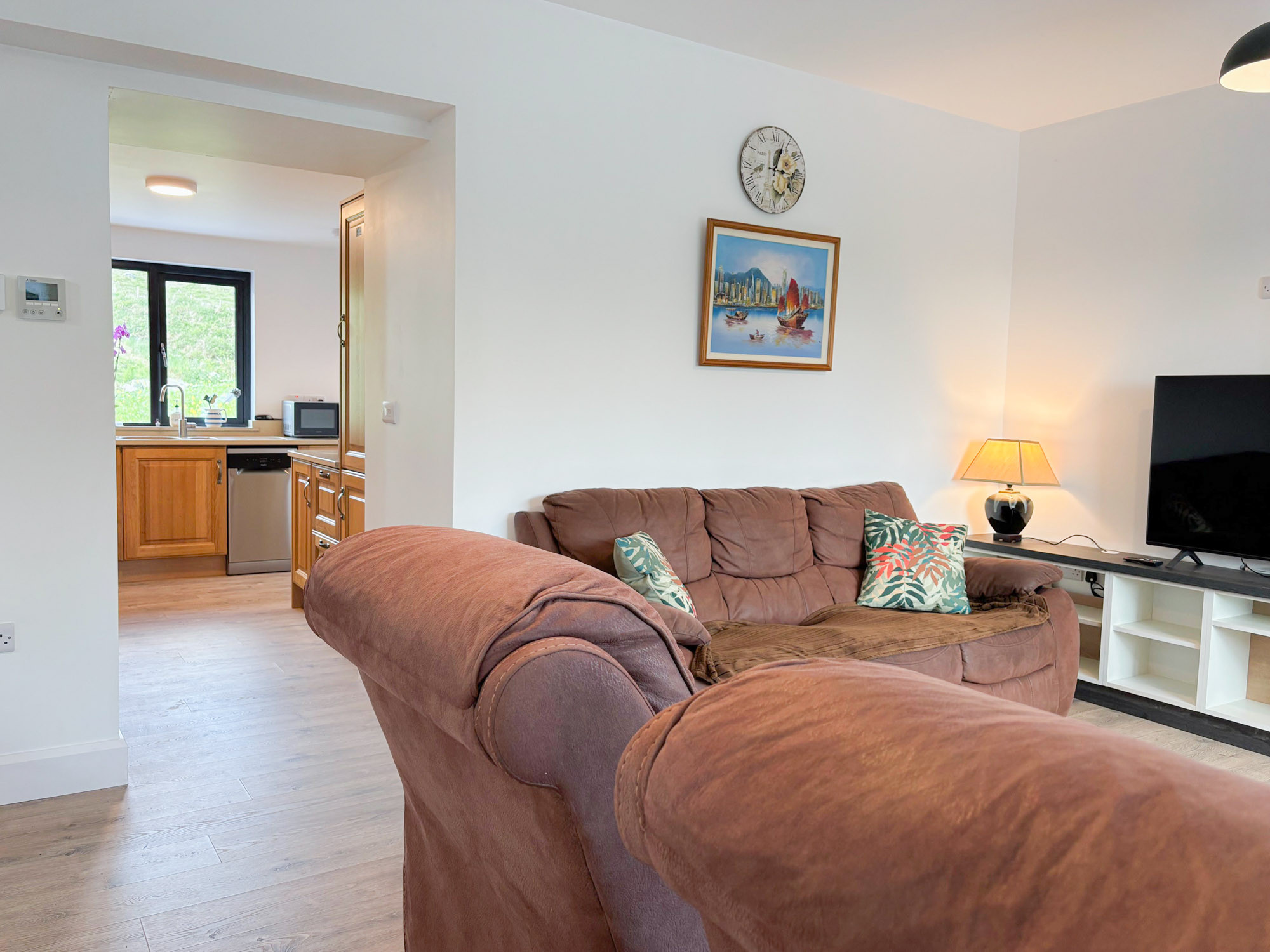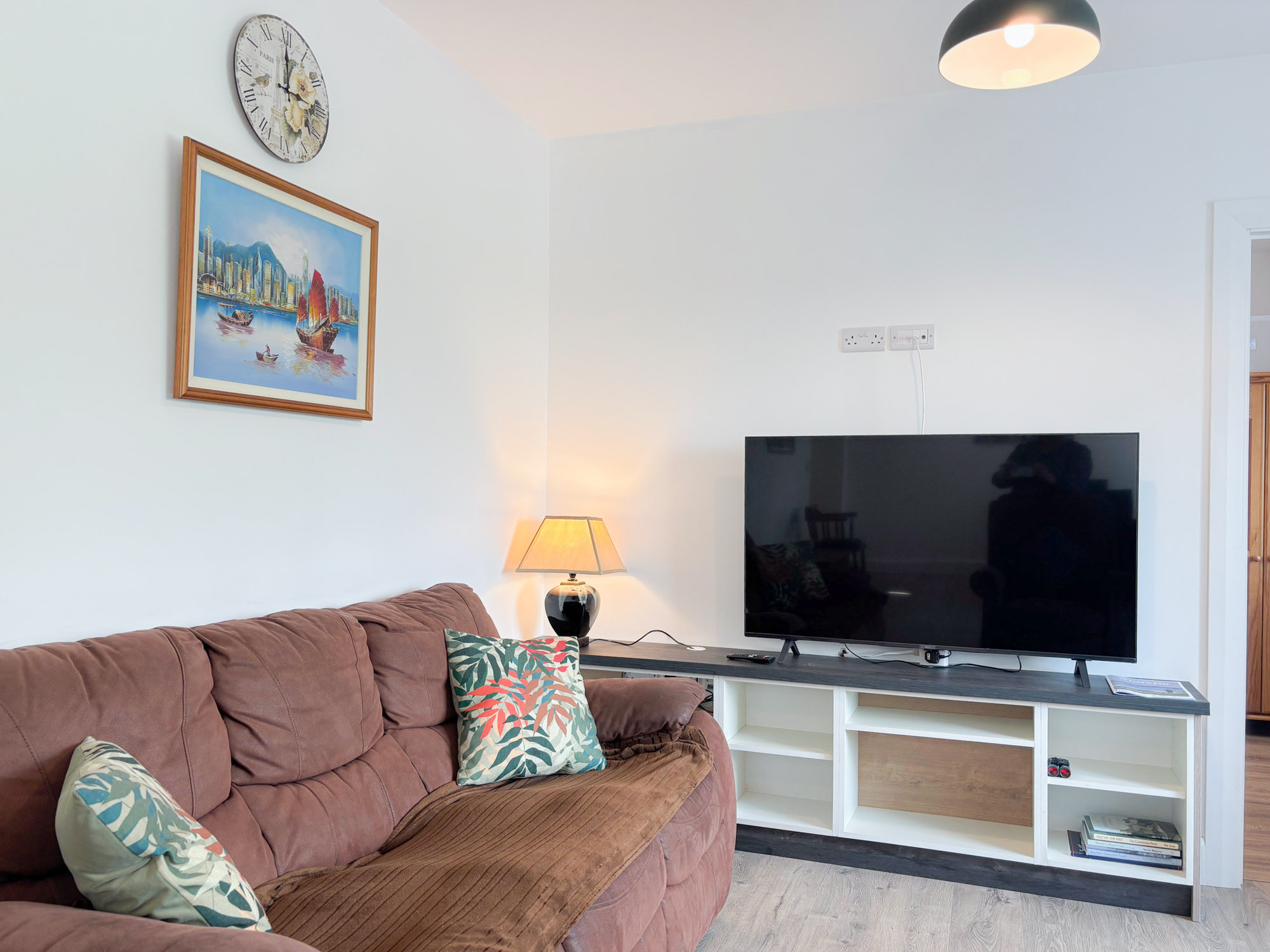 - Spacious and modern living room with large screen multi-channel TV and electrical coal effect fire